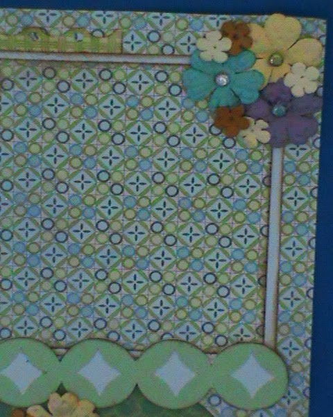 | This diamond border is from Silhouette store and cut at 1" x 8". I also have used Prima flowers in the corner of the photo mat. I put sparkle brads in the center of the large flowers. |